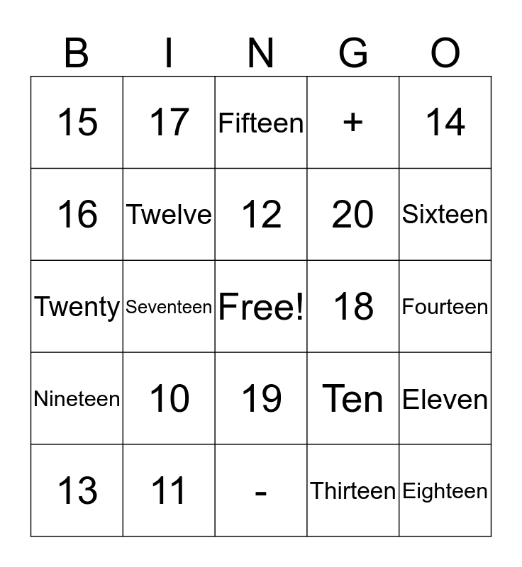 This bingo card has a free space and 24 words: 10, 11, 12, 13, 14, 15, 16, 17, 18, 19, 20, Twenty, Ten, Eleven, Twelve, Thirteen, Fourteen, Fifteen, Sixteen, Seventeen, Eighteen, Nineteen, + and -.