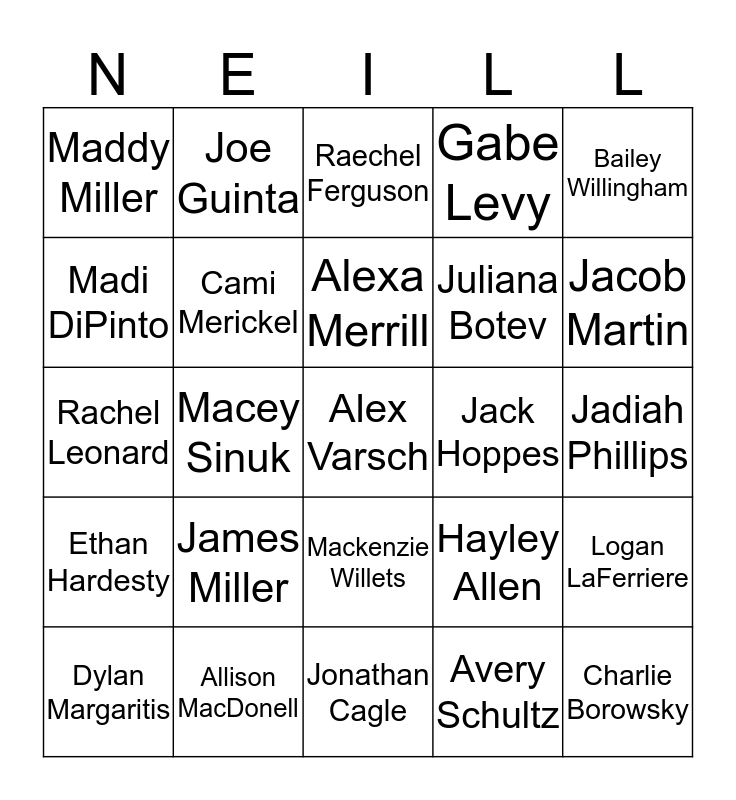 This bingo card has 27 words: Hayley Allen, Charlie Borowsky, Juliana Botev, Jonathan Cagle, Madi DiPinto, Raechel Ferguson, Joe Guinta, Ethan Hardesty, Jack Hoppes, Logan LaFerriere, Rachel Leonard, Gabe Levy, Dylan Margaritis, Allison MacDonell, Jacob Martin, Maggie McBride, Cami Merickel, Alexa Merrill, James Miller, Maddy Miller, Jadiah Phillips, Avery Schultz, Macey Sinuk, Alex Varsch, Mackenzie Willets, Bailey Willingham and Delaney Yule.