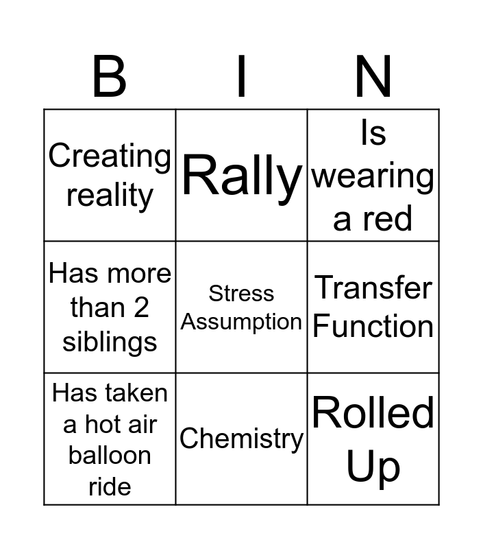 This bingo card has a free space and 24 words: Ingest, Cascade, Chemistry, Aligned, Rolled Up, Creating reality, Transfer Function, Rally, Knows ballroom dancing, Has won an award, Is wearing a sock with a hole in it, Ran a 10 K, Has acted in a play, Owns an iPod, Has taken a hot air balloon ride, Rides a motorcycle, Is taking a camping trip this summer, Is wearing a red, Owns an unusual animal, Took piano lessons, Same middle name as you, Has a July Birthday, Has more than 2 siblings and Has a second job.