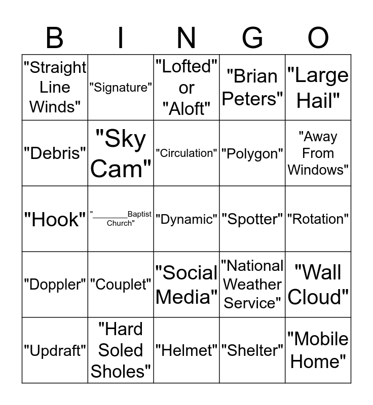 This bingo card has 30 words: "Hard Soled Sholes", "________ BBQ", "________Baptist Church", "________Court House", "Straight Line Winds", "Lofted" or "Aloft", "Sky Cam", "Social Media", "Spotter", "Helmet", "Rotation", "Dynamic", "Shelter", "Mobile Home", "Away From Windows", "Inflow", "National Weather Service", "Doppler", "Couplet", "Large Hail", "Hook", "Gordo", "Signature", "Polygon", "Debris", "Brian Peters", "Wall Cloud", "Updraft", "Circulation" and "Chaser".