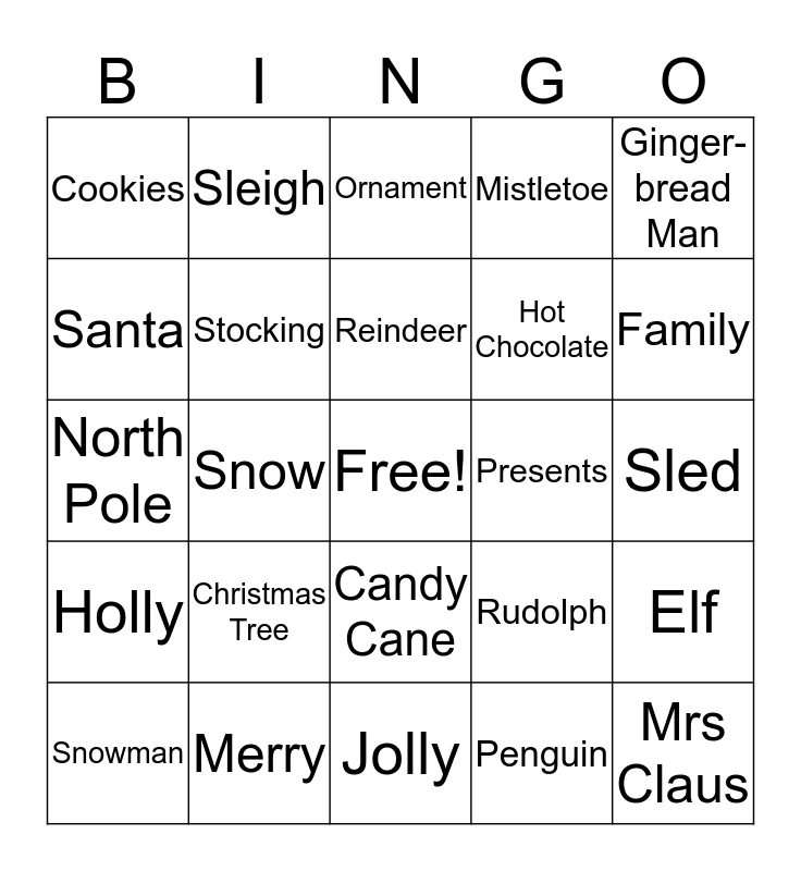 This bingo card has a free space and 24 words: Christmas Tree, Merry, Reindeer, Snowman, Ginger-bread Man, Cookies, Santa, Sleigh, Presents, Candy Cane, Hot Chocolate, North Pole, Rudolph, Elf, Stocking, Penguin, Sled, Ornament, Family, Snow, Mrs Claus, Holly, Mistletoe and Jolly.