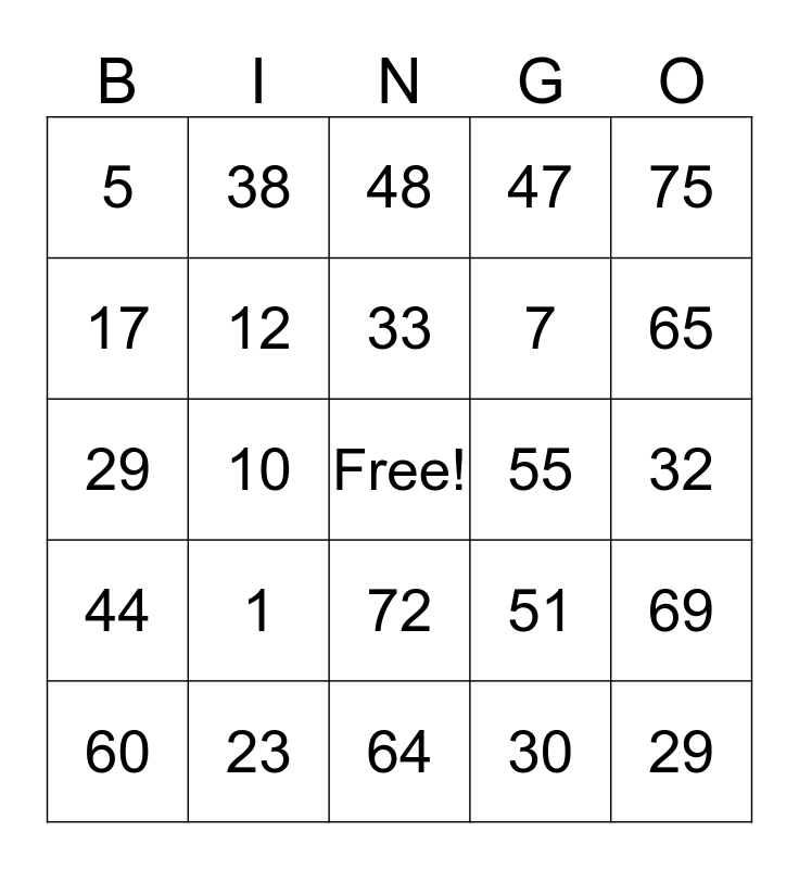 This bingo card has a free space and 24 words: 1, 23, 33, 60, 75, 5, 17, 38, 55, 72, 7, 29, 51, 69, 12, 30, 32, 48, 65, 10, 29, 44, 47 and 64.