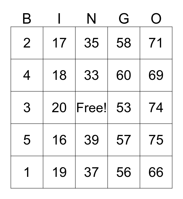 This bingo card has a free space and 24 words: 1, 16, 33, 56, 71, 2, 17, 35, 53, 74, 3, 18, 57, 75, 4, 19, 37, 58, 69, 5, 20, 39, 60 and 66.