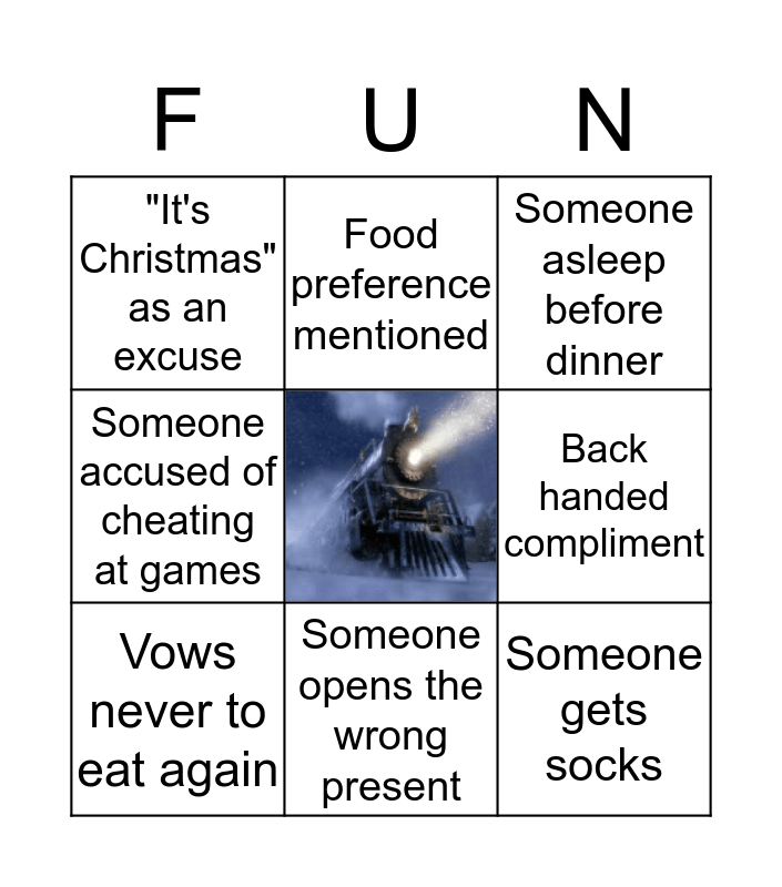 This bingo card has a free space and 8 words: Someone accused of cheating at games, Food preference mentioned, Back handed compliment, Vows never to eat again, Someone asleep before dinner, "It's Christmas" as an excuse, Someone opens the wrong present and Someone gets socks.