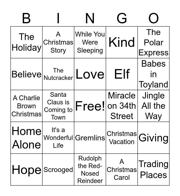 This bingo card has a free space and 30 words: Scrooged, Christmas With the Kranks, Santa Claus is Coming to Town, Santa Clause, The Holiday, While You Were Sleeping, The Nutcracker, Gremlins, Miracle on 34th Street, Rudolph the Red-Nosed Reindeer, Jingle All the Way, Trading Places, A Christmas Carol, The Grinch, Babes in Toyland, Nightmare Before Christmas, Christmas Vacation, Home Alone, It's a Wonderful Life, The Polar Express, A Charlie Brown Christmas, Planes, Trains & Automobiles, A Christmas Story, Elf, Believe, Kind, Giving, Hope, Love and Generous.