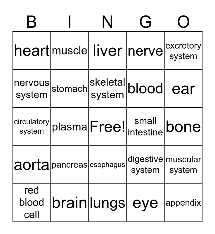 This bingo card has a free space and 29 words: red blood cell, white blood cell, plasma, kidney, heart, liver, stomach, pancreas, small intestine, brain, bone, appendix, lungs, eye, ear, nose, esophagus, aorta, excretory system, circulatory system, digestive system, respiratory system, blood, nervous system, nerve, muscle, muscular system, skeletal system and spinal cord.