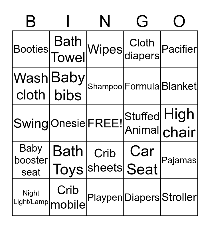 This bingo card has a free space and 32 words: Diapers, Baby socks, Onesie, Baby bottles, Baby booster seat, Baby bibs, Pacifier, Pajamas, Bath Towel, Bath Tub, Shampoo, Wipes, Book, Playtime Mat, Stuffed Animal, Walker, Night Light/Lamp, Swing, Crib sheets, Bath Toys, Car Seat, Baby T-shirts, High chair, Crib mobile, Stroller, Cloth diapers, Formula, Wash cloth, Booties, Playpen, Hamper and Blanket.