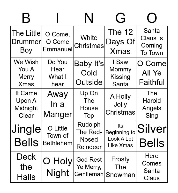 This bingo card has 30 words: O Holy Night, Joy To The World, Away In a Manger, Silent Night, The Little Drummer Boy, White Christmas, Do You Hear What I hear, Rudolph The Red-Nosed Reindeer, A Holly Jolly Christmas, God Rest Ye Merry, Gentleman, The Harold Angels Sing, Up On The House Top, Frosty The Snowman, Here Comes Santa Claus, O Come All Ye Faithful, Have Yourself A Merry Little Xmas, Its Beginning to Look A Lot Like Xmas, Jingle Bells, O Little Town of Bethlehem, Santa Claus Is Coming To Town, It Came Upon A Midnight Clear, Let It Snow, O Come, O Come Emmanuel, I Saw Mommy Kissing Santa, We Wish You A Merry Xmas, The 12 Days Of Xmas, Silver Bells, Deck the Halls, Baby It's Cold Outside and Go Tell It on The Mountain.