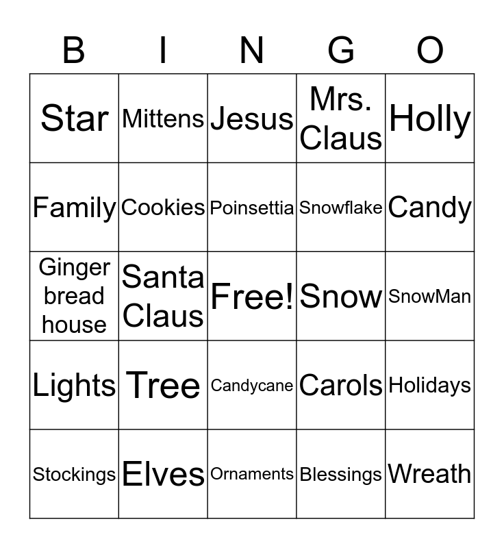 This bingo card has a free space and 29 words: Stockings, Presents, Santa Claus, Reindeer, Star, Jesus, Cookies, Tree, Snow, Elves, SnowMan, Wreath, Ornaments, Blessings, Candy, Nutcracker, Candycane, Lights, Holly, Ginger bread house, Carols, Gifts, Snowflake, Family, Mrs. Claus, Mittens, Holidays, Poinsettia and Candles.