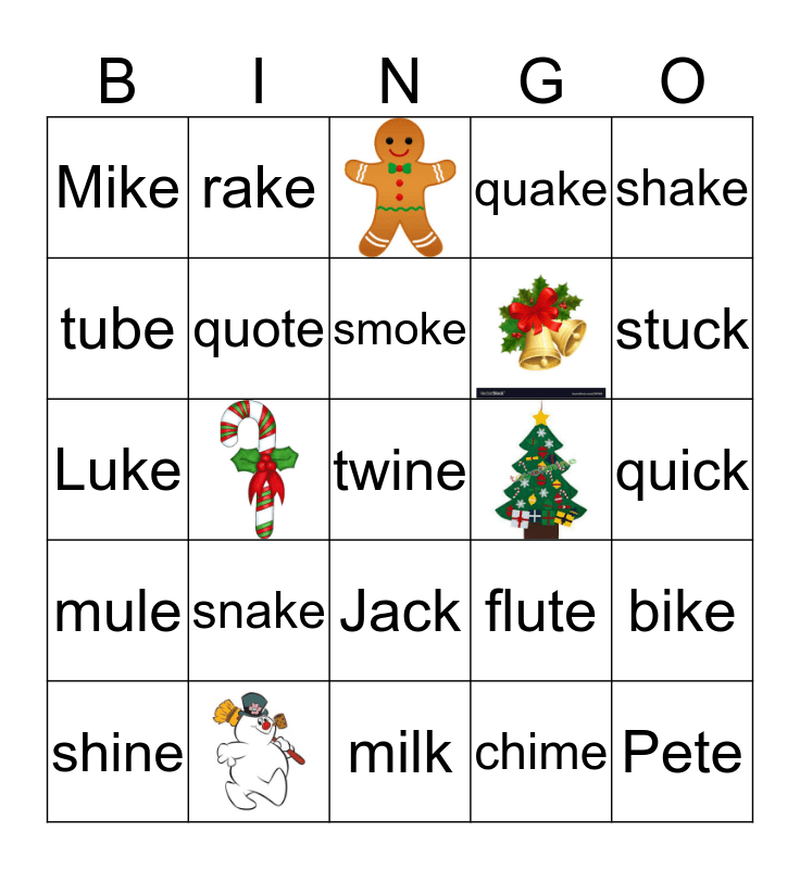 This bingo card has 5 images, a free space and 19 words: snake, smoke, shine, shake, Mike, tube, rake, Jack, Luke, flute, bike, quote, chime, quick, stuck, Pete, mule, quake and milk.