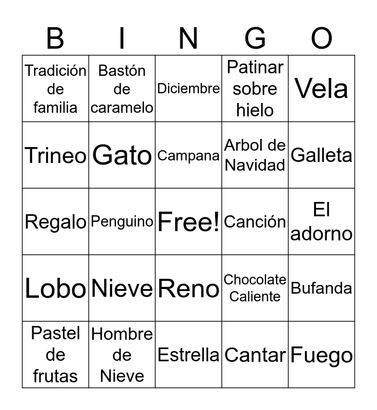 This bingo card has a free space and 24 words: Nieve, Hombre de Nieve, Campana, Pastel de frutas, Vela, Tradición de familia, Trineo, Bastón de caramelo, Canción, Reno, Arbol de Navidad, Regalo, Chocolate Caliente, Bufanda, Gato, Cantar, El adorno, Diciembre, Galleta, Penguino, Fuego, Lobo, Patinar sobre hielo and Estrella.