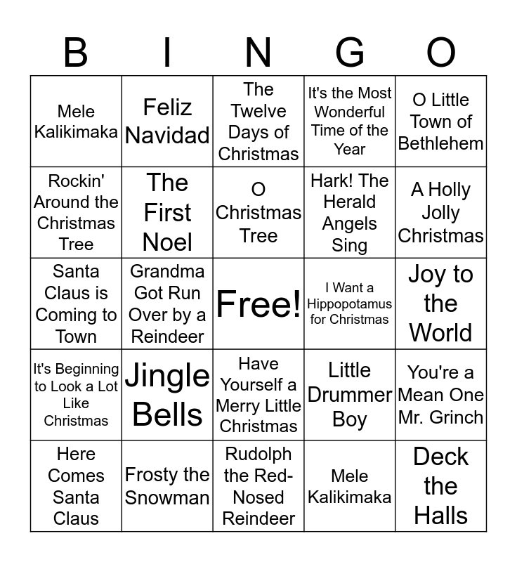This bingo card has a free space and 34 words: You're a Mean One, Mr. Grinch, Mele Kalikimaka, I Want a Hippopotamus for Christmas, Silent Night, It's Beginning to Look a Lot Like Christmas, The First Noel, O Little Town of Bethlehem, Here Comes Santa Claus, Feliz Navidad, Away In a Manger, O Christmas Tree, The Twelve Days of Christmas, Let it Snow, Go Tell It on the Mountain, I Want a Hippopotamus for Christmas, A Holly Jolly Christmas, Frosty the Snowman, Santa Claus is Coming to Town, Jingle Bells, Little Drummer Boy, Have Yourself a Merry Little Christmas, Jingle Bell Rock, Mele Kalikimaka, Joy to the World, Rudolph the Red-Nosed Reindeer, Deck the Halls, It's the Most Wonderful Time of the Year, I'll Be Home For Christmas, Hark! The Herald Angels Sing, Rockin' Around the Christmas Tree, I Saw Mommy Kissing Santa Claus, Grandma Got Run Over by a Reindeer, You're a Mean One Mr. Grinch and I Wish You a Merry Christmas.