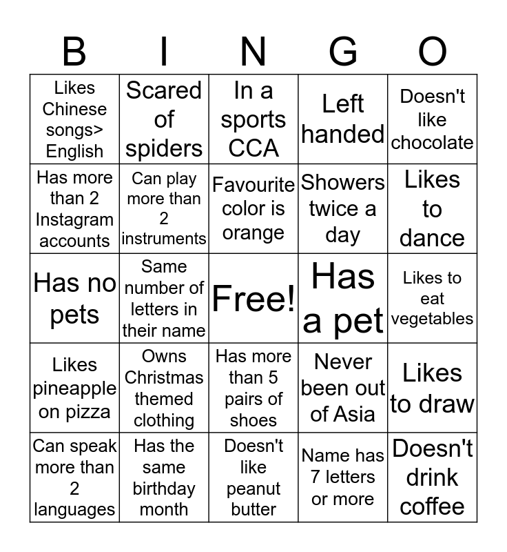 This bingo card has a free space and 24 words: Owns Christmas themed clothing, Has the same birthday month, Favourite color is orange, Can speak more than 2 languages, Doesn't like chocolate, Likes Chinese songs> English, Has more than 2 Instagram accounts, Scared of spiders, Has a pet, Has more than 5 pairs of shoes, Showers twice a day, Has no pets, Never been out of Asia, Likes to draw, Can play more than 2 instruments, Name has 7 letters or more, Likes to eat vegetables, In a sports CCA, Likes to dance, Same number of letters in their name, Doesn't drink coffee, Likes pineapple on pizza, Left handed and Doesn't like peanut butter.