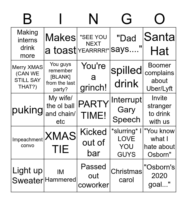 This bingo card has a free space and 24 words: XMAS TIE, IM Hammered, You're a grinch!, Light up Sweater, Santa Hat, Making interns drink more, Merry XMAS (CAN WE STILL SAY THAT?), Makes a toast, Interrupt Gary Speech, Kicked out of bar, spilled drink, puking, *slurring* I LOVE YOU GUYS, "You know what I hate about Osborn", You guys remember [BLANK] from the last party?, Christmas carol, Invite stranger to drink with us, "SEE YOU NEXT YEARRRR!", Boomer complains about Uber/Lyft, My wife/ the ol ball and chain/ etc, "Osborn's 2020 goal...", Impeachment convo, "Dad says...." and Passed out coworker.