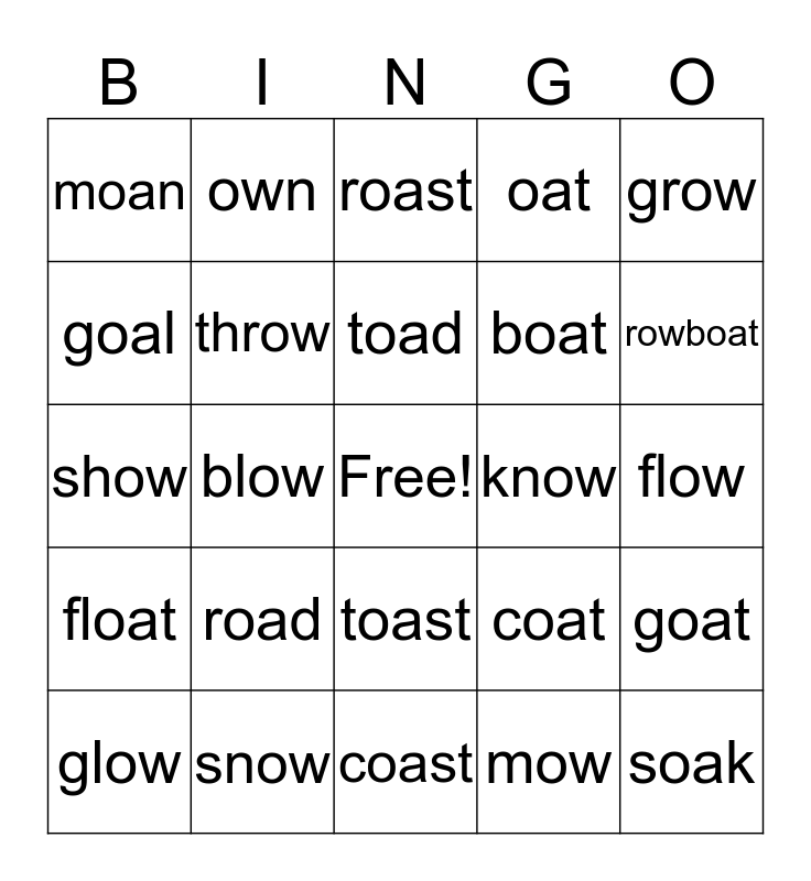 This bingo card has a free space and 24 words: road, snow, toad, glow, grow, moan, goal, own, know, toast, boat, show, coat, goat, throw, mow, flow, roast, rowboat, blow, soak, float, oat and coast.