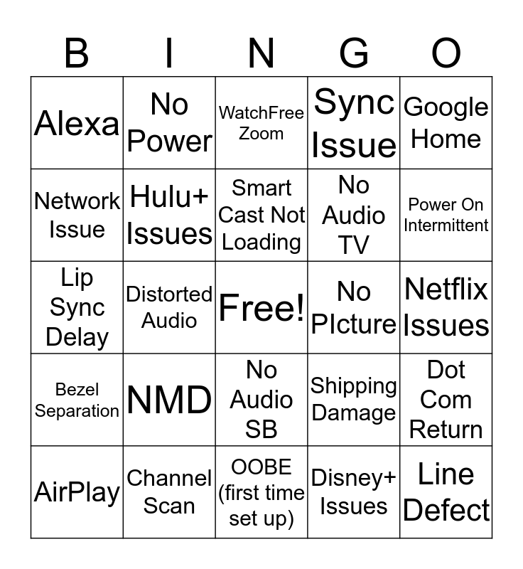 This bingo card has a free space and 24 words: NMD, Channel Scan, Smart Cast Not Loading, AirPlay, Google Home, Alexa, Network Issue, No Power, No PIcture, No Audio SB, No Audio TV, Lip Sync Delay, Shipping Damage, Dot Com Return, Hulu+ Issues, Disney+ Issues, Netflix Issues, WatchFree Zoom, Power On Intermittent, Distorted Audio, Line Defect, Bezel Separation, Sync Issue and OOBE (first time set up).
