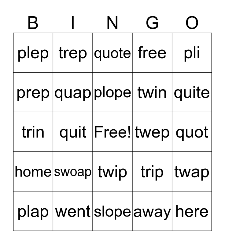 This bingo card has a free space and 25 words: swoap, slope, plope, plap, pli, plep, prep, trep, twep, twip, twin, trin, trip, twap, quap, quop, quot, quote, quite, quit, here, went, home, free and away.