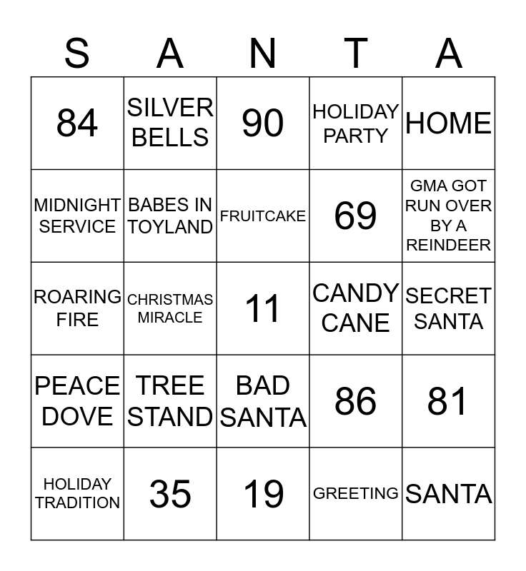This bingo card has a free space and 292 words: 1, MIRACLE ON 34TH STREET, HOLIDAY PARTY, GIFTS, THE MUPPETT CAROL, CHRISTMAS SALES, 99, CAROLER, CANDLES, BIRTH, SHOPPING, 57, WREATH, BUFFET DINNER, HOLIDAY GALA, 23, HALLELUJAH CHORUS, SNOW, SANTA BABY, 15, ROARING FIRE, 90, 67, 87, 47, BLESSING, HAVE URSELF A MERRY LITTLE CHRISTMAS, 110, ERNEST SAVES CHRISTMAS, SNOWFALL, BOWS, 9, TREE STAND, 52, CAROL OF THE BELLS, NATIONAL LAMPOONXMAS VACATION, 20, 101, 40, LETTER TO SANTA, NORTH POLE, 8, 24, TRIMMINGS, WISE MEN, 55, HOME, LET IT SNOW, CHRISTMAS CAROL, CHRISTMAS FUTURE, 58, 69, GRINCH, MICKEY XMAS CAROL, SECRET SANTA, HOLIDAY MAGIC, PEPPERMINT, BABES IN TOYLAND, ELF, MR. GRINCH, 66, 30, ANGEL, 12 DAYS OF CHRISTMAS, FEAST, 77, MISTLETOE, HOLIDAY TIDINGS, CAROL, GREETING, 89, 29, 88, JINGLE BELL ROCK, NOEL, SNOW ANGEL, CHRISTMAS PRESENT, FAMILY, GOODWILL, THE ENCHANTED CHRISTMAS, ELVES, SCROOGE, 85, XMAS MORNING, 19, ILL BE HOME FOR XAMS, MARY, GLAD TIDINGS, HOLIDAY SPIRIT, O COME ALL YE FAITHFUL, 46, 22, 109, RUDOLPH, FREE!, FAMILY GATHERING, 44, BAD SANTA, BLUE CHRISTMAS, FIGGY PUDDING, WHITE CHRISTMAS, 51, HOLIDAY CHEER, DR SEUSS HOW THE GRINCH STOLE XMAS, 106, SANTA'S BAG, HOLIDAY TRADITION, 50, SANTA'S LIST, SEASONS GREETINGS, JOY TO THE WORLD, POINSETTIA, CHEER, LUMP OF COAL, SLED, JOLLY WISHES, SLEIGH RIDE, 100, SILENT NIGHT, SNOWFLAKE, ITS BEGINNINTO LOOK LIKE XMAS, 28, GATHERING, CHRISTMAS STAR, DECORATIONS, NATIVITY SCENE, SANTA, 35, I SAW MOMMY KISSING SANTA, 31, 94, 34, 93, 102, CANDY CANE, CHRISTMAS STORY, MASS, FAMILY REUNION, BIRTH OF CHRIST, 71, TINSEL, 74, EGGNOG, CHRISTMAS WISH, ITS A WONDERFUL LIFE, MIDNIGHT SERVICE, 65, JACK FROST, 13, VISIONS OF SUGAR PLUMS, UP ON THE HOUSETOP, FESTIVAL, 5, 53, SILVER BELLS, 41, MUST BE SANTA, ITS THE MOST WONDERFUL TIME OF YR, STOCKING STUFFER, 25, CEDAR, BELLS, 33, O HOLY NIGHT, KRISS KRINGLE, DRUMMER BOY, 10, 3, GMA GOT RUN OVER BY A REINDEER, BABY, CHRISTMAS DINNER, 48, TWAS THE NIGHT BEFORE CHRISTMAS, 60, 36, CHRISTMAS DAY, 79, CHRISTMAS COOKIE, 70, O CHRISTMAS TREE, HOME ALONE, CHRISTMAS, CHRISTMAS FOR COWBOYS, CHRISTMAS MIRACLE, MIRACLE, CHRISTMAS MONEY, CHRISTMAS LIGHTS, 95, 39, 83, MENORAH, 84, 42, MIRACLE OF CHRISTMAS, GIFT BOXES, TOYS, HARK THE HAROLD ANGELS SING, CHRISTMAS EVE, GINGERBREAD HOSUE, SLEIGH BELLS, CHRISTMAS PLAY, SHREK THE HALLS, STARLIGHT, MINCE PIE, CHIPMUNK CHRISTMAS, CHRISTMAS GIFT, 63, TIDING, CELEBRATION, UR HOLIDAY BEST, SUGAR PLUMS, ADVENT CALENDAR, 37, CHARLIE BROWN XMAS, FRESH SNOWBALL, SEASON, 75, 98, GALA, PEACE, THIS IS THAT TIME OF YEAR, CAMEL, DRESSING, DO YOU HEAR WHAT I HEAR?, 96, PEACE DOVE, SPIRIT, ST NICK, 61, 56, 14, RIBBON, 81, ALL I WANT FOR CHRISTMAS, CHRISTMAS PAGEANT, 59, 105, HOLIDAY, SANTA SLEIGH, HOLIDAY CLASSIC, FRUITCAKE, DOLLS, 72, FIR, 97, WINTER, ORNAMENT, SHEPHERD, SERVICE, SANTAS ELVES, BUSY ELVES, TRADITION, ROCKING AROUND THE XMAS TREE, CHRISTMAS CARD, 68, 73, JOY, HOLIDAY FAVORITE, JINGLE BELLS, GIFT LIST, HOLLY JOLLY XMAS, STAR, 16, REINDEER, 4, 92, SANTA IS COMING TO TOWN, 21, PLUMS, 86, 32, ELF, 43, DECK THE HALLS, 2, FROSTY THE SNOWMAN, 62, GREATEST GIFT OF ALL, 18, CRANBERRY SAUCE, GOOD LUCK CHARLIE ITS XMAS, NUTCRACKER, PINE, 64, PARADE, OVER THE RIVER THROUGH THE WOODS, 108, 17, 103, BEETHOVEN XMAS ADVENTURE, STOCKING and MUPPET FAMILY XMAS.