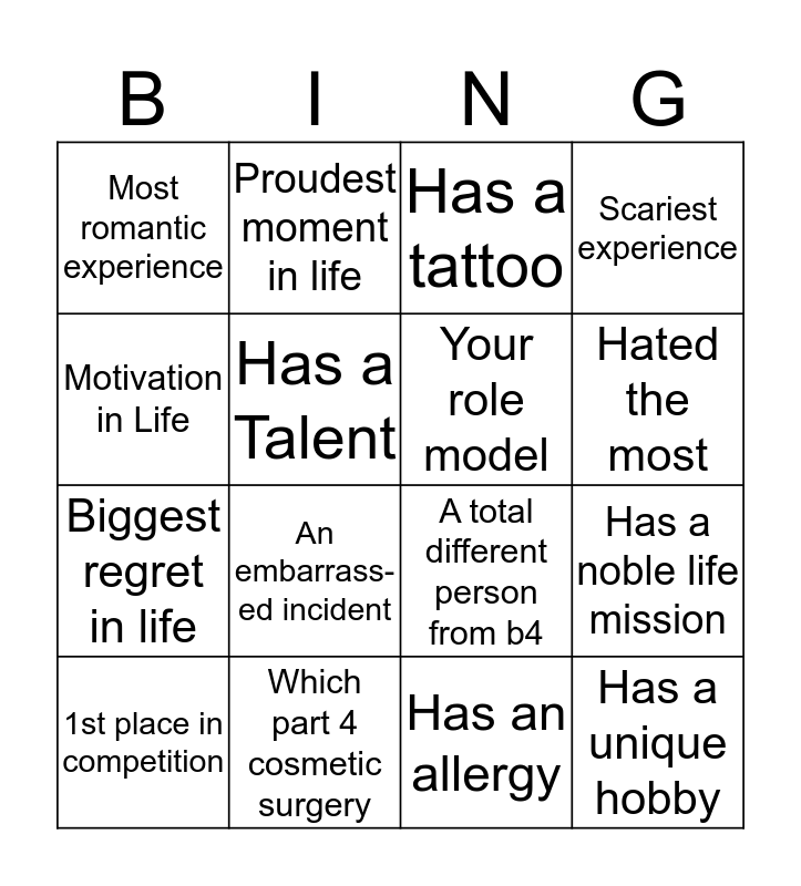 This bingo card has 16 words: Which part 4 cosmetic surgery, Has a noble life mission, Has a tattoo, Most romantic experience, Biggest regret in life, Proudest moment in life, A total different person from b4, Has an allergy, Motivation in Life, Has a Talent, 1st place in competition, Scariest experience, An embarrass-ed incident, Hated the most, Your role model and Has a unique hobby.