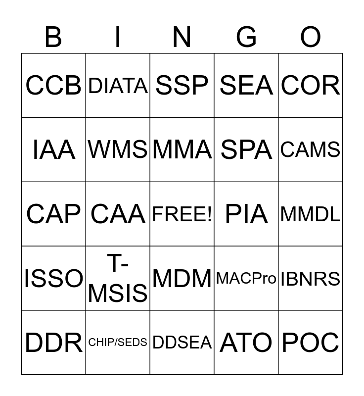 This bingo card has a free space and 36 words: MBES/CBES, CARTS, MDR, WMS, MACPro, ISSO, MMA, MSIS, COR, CFACTS, CAA, SEA, APD, PIA, CAMS, CCB, MACBIS, T-MSIS, POC, SSP, MMDL, IBNRS, CHIP/SEDS, DDR, DDSEA, DIATA, CAP, IACS, SPA, IAA, ORNL, MMCDC, ATO, MDM, CP and ILC.