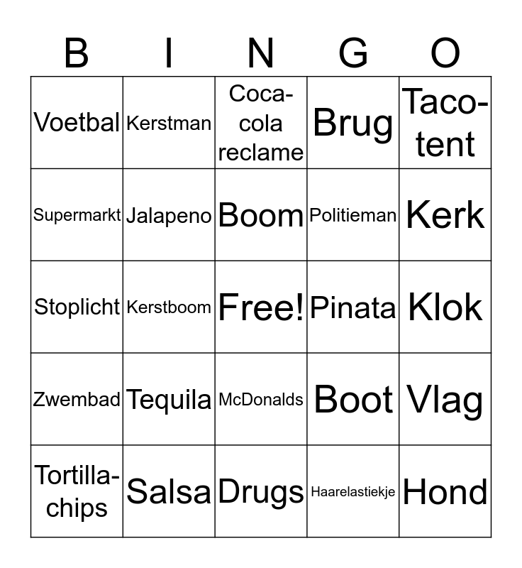This bingo card has a free space and 42 words: Mexicaan, Boom, Gele auto, Tequila, Haarelastiekje, Vlag, Hond, Bloemenwinkel, Coca-cola reclame, McDonalds, Klok, Kerk, Kerstboom, Taco-tent, Sombrero, Boot, Kinderwagen, Stoplicht, Vliegtuig, Kerstman, Supermarkt, Andere Jaarclub, Boek, Voetbal, Palmboom, Day of the Dead, Politieman, Corona, Cactus, Gitaar, Hangmat, Zwembad, Jalapeno, Drugs, Avocado, Tortilla-chips, Salsa, Pinata, Ijs, Zwangere vrouw, Brug and Camera.