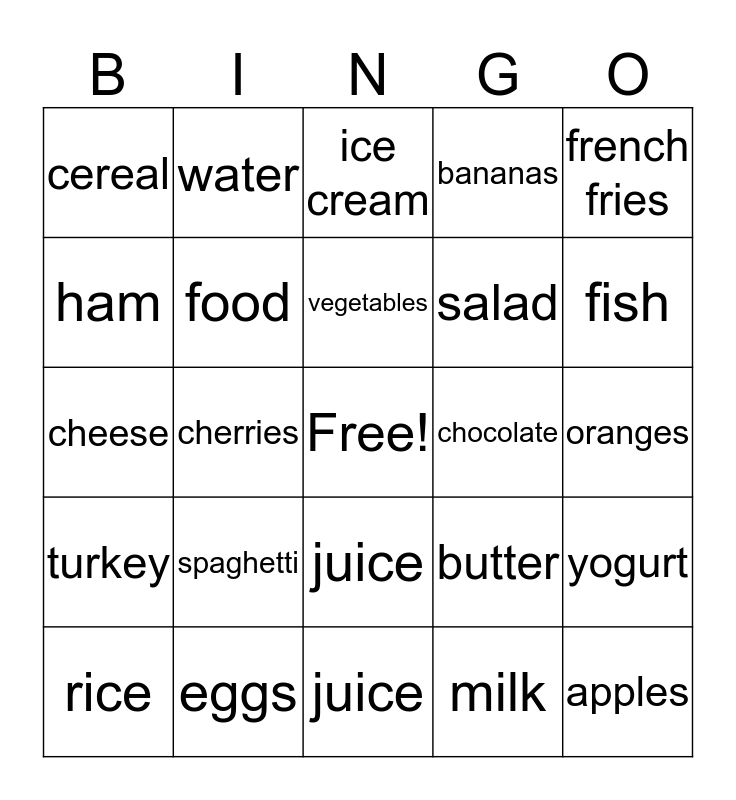 This bingo card has a free space and 38 words: pizza, ice cream, soda, food, yogurt, spaghetti, vegetables, soup, french fries, salad, cherries, bananas, apples, oranges, ham, turkey, cake, ice cream, doughnuts, chocolate, cereal, eggs, fish, rice, apples, juice, milk, coffee, tea, coffee, tea, juice, milk, water, bread, butter, cheese and lobster.