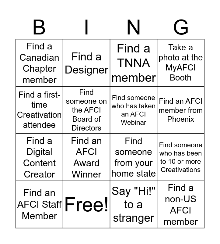 This bingo card has 16 words: Free!, Find someone who has been to 10 or more Creativations, Find a TNNA member, Find a Canadian Chapter member, Find a Digital Content Creator, Find a Designer, Find someone from your home state, Say "Hi!" to a stranger, Find a first-time Creativation attendee, Find someone on the AFCI Board of Directors, Find an AFCI Staff Member, Take a photo at the MyAFCI Booth, Find an AFCI Award Winner, Find an AFCI member from Phoenix, Find someone who has taken an AFCI Webinar and Find a non-US AFCI member.