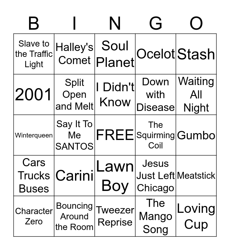 This bingo card has a free space and 24 words: Carini, Bouncing Around the Room, I Didn't Know, Character Zero, Stash, Slave to the Traffic Light, 2001, Halley's Comet, The Squirming Coil, Lawn Boy, Down with Disease, Winterqueen, Jesus Just Left Chicago, Meatstick, Split Open and Melt, The Mango Song, Gumbo, Soul Planet, Waiting All Night, Say It To Me SANTOS, Loving Cup, Cars Trucks Buses, Ocelot and Tweezer Reprise.