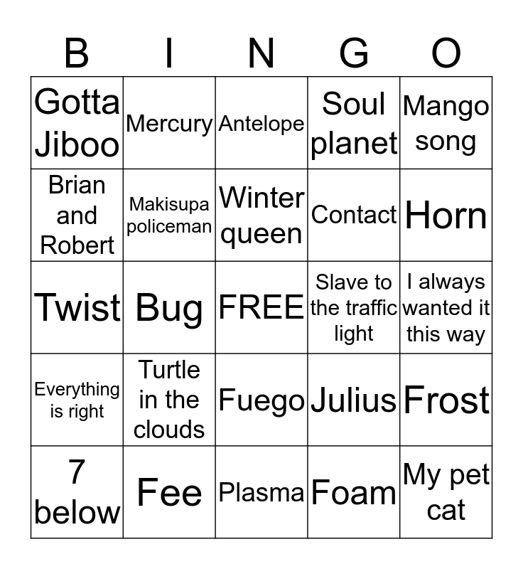 This bingo card has a free space and 24 words: Turtle in the clouds, Fee, Winter queen, 7 below, Mango song, Gotta Jiboo, Brian and Robert, Mercury, Slave to the traffic light, Fuego, Contact, Twist, Julius, Frost, Makisupa policeman, Foam, I always wanted it this way, Antelope, Horn, Bug, My pet cat, Everything is right, Soul planet and Plasma.