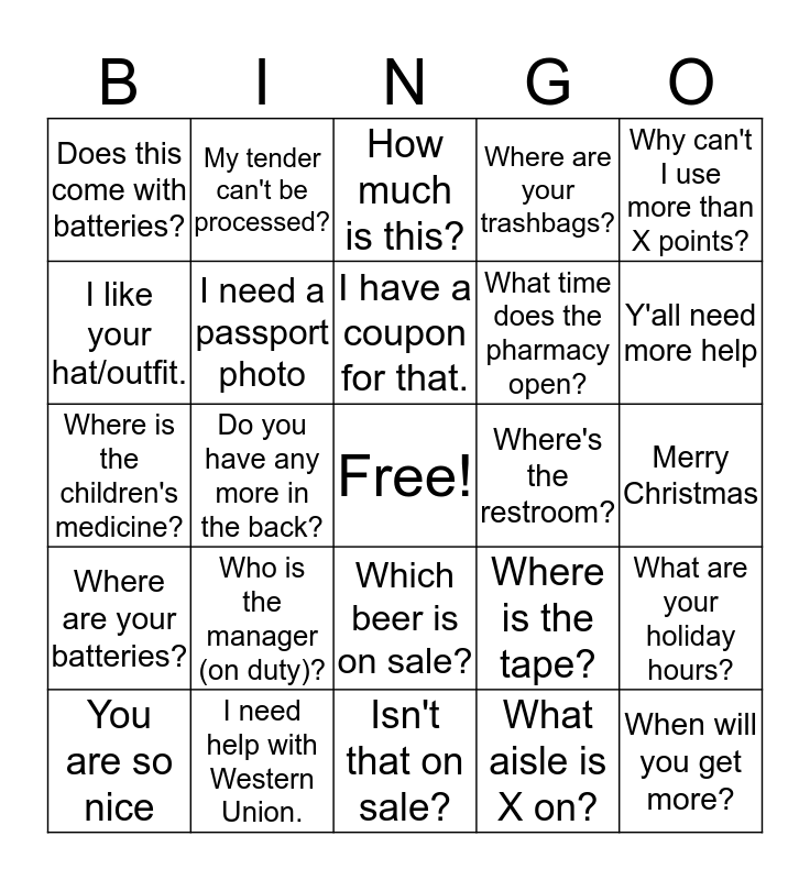 This bingo card has a free space and 29 words: You are so nice, Do you have a pack of cigs?, Do you have any more in the back?, Do you have any milk?, Does this come with batteries?, How much is this?, I need a passport photo, Who is the manager (on duty)?, Where's the restroom?, I need help with Western Union., Merry Christmas, When will you get more?, Isn't that on sale?, What aisle is X on?, Y'all need more help, Do I have any points?, Which beer is on sale?, Where are your batteries?, Why can't I use more than X points?, Where is the children's medicine?, Where is the tape?, That costs how much?, What time does the pharmacy open?, I like your hat/outfit., Where are your trashbags?, My tender can't be processed?, What are your holiday hours?, I have a coupon for that. and Can I get help in photo?.