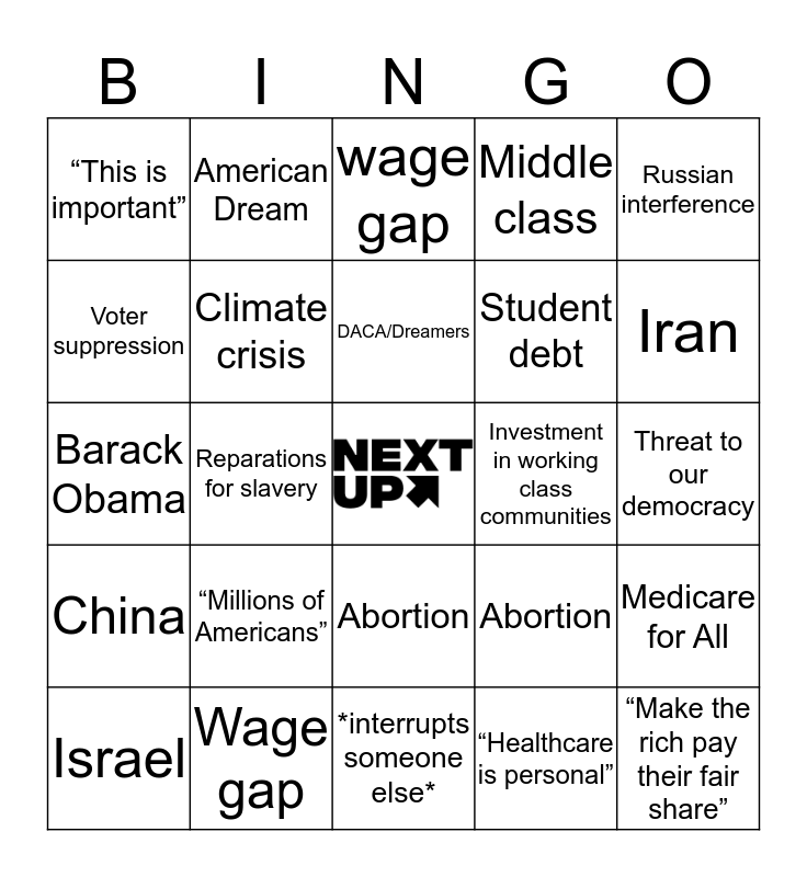This bingo card has a free space and 46 words: *shaking head*, “Make the rich pay their fair share”, “I promise”, *interrupts someone else*, “Millions of Americans”, “My plan”, American Dream, Universal Basic Income, Voter suppression, Deportations, Climate crisis, Middle class, Medicare for All, Abortion, *Plugs website*, LGBTQIA+, DACA/Dreamers, Investment in working class communities, BIG money, Russian interference, Reparations for slavery, “Healthcare is personal”, “This is important”, Student debt, The 1%, Iran, Israel, Green New Deal, Abortion, China, A pantsuit is worn, "Corrupt", Abolish private insurance, Democratic Socialism, Raising minimum wage, Wage gap, Threat to our democracy, Criminal justice system, Unions, Impeachment, Guns, wage gap, Barack Obama, *exceeds time*, *inserts real life story* and Tweets.