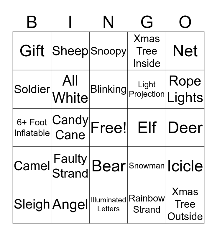 This bingo card has a free space and 41 words: 2000s+ Character, 6+ Foot Inflatable, All Blue, All White, Angel, Bear, Blinking, Bow, Net, Camel, Candy Cane, Xmas Tree Inside, Xmas Tree Outside, Deer, Elf, Faulty Strand, Flashing TV, Gift, Grinch, Snoopy, Icicle, Jesus, Illuminated Letters, Light Projection, Mouse, Poinsettia, Rainbow Strand, Rooftop Decor, Rope Lights, Rudolph, Santa, Sheep, Sleigh, Snowflake, Snowman, Soldier, Star, Stocking, Train, Window Candle and Wreath.