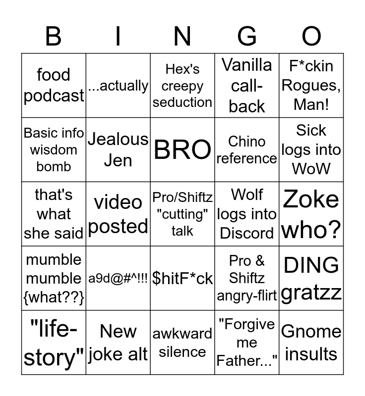 This bingo card has 25 words: a9d@#^!!!, awkward silence, BRO, "life-story", F*ckin Rogues, Man!, food podcast, Basic info wisdom bomb, ...actually, Wolf logs into Discord, $hitF*ck, Chino reference, that's what she said, Pro & Shiftz angry-flirt, DING gratzz, Jealous Jen, Gnome insults, Zoke who?, Hex's creepy seduction, Sick logs into WoW, video posted, Pro/Shiftz "cutting" talk, New joke alt, mumble mumble {what??}, Vanilla call-back and "Forgive me Father...".