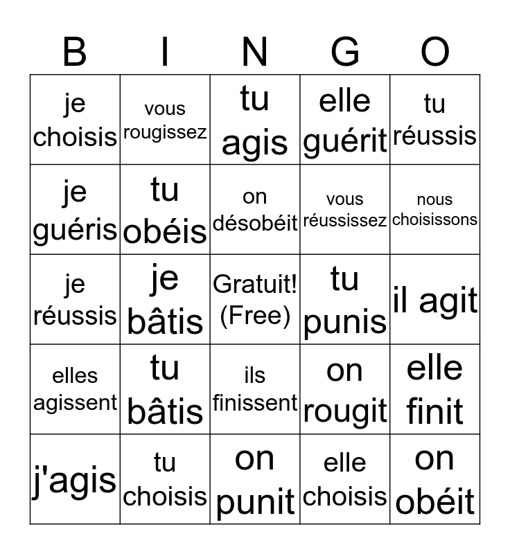 This bingo card has a free space and 29 words: j'agis, j'obéis, je bâtis, je punis, je choisis, tu agis, tu obéis, tu bâtis, tu punis, tu choisis, il agit, on obéit, on punit, elle choisis, nous choisissons, vous choisissez, ils finissent, elles agissent, tu réussis, je réussis, on rougit, ils punissent, vous réussissez, je guéris, elle guérit, vous rougissez, elle finit, on désobéit and on remplit.