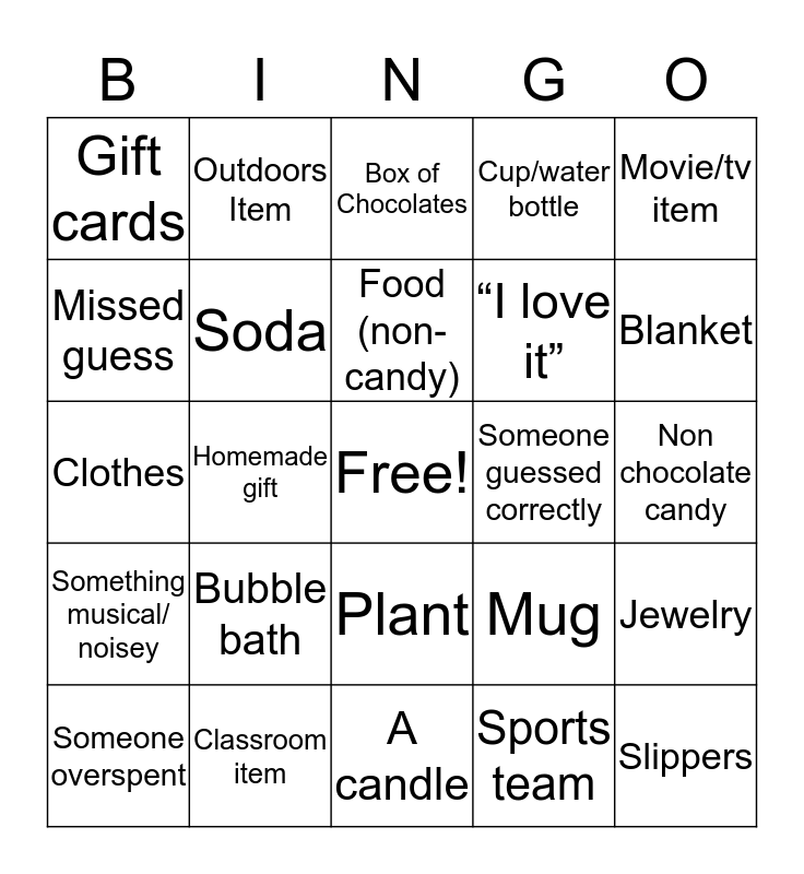 This bingo card has a free space and 29 words: Someone overspent, Coffee, Homemade gift, A toy, Gift cards, Box of Chocolates, Soda, Bubble bath, Someone guessed correctly, Classroom item, Non chocolate candy, Slippers, A candle, Sports team, Blanket, Socks, Plant, Something musical/ noisey, Movie/tv item, Clothes, Mug, Flowers, “I love it”, Missed guess, Cup/water bottle, Outdoors Item, Jewelry, Food (non-candy) and 3 wrong guesses.