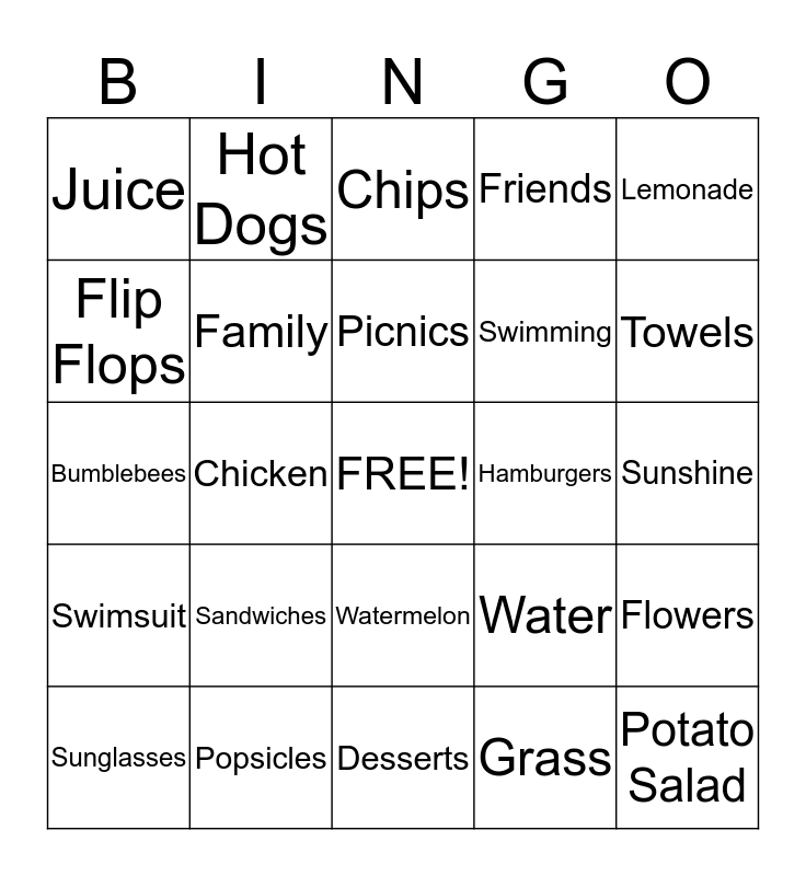 This bingo card has a free space and 24 words: Sandwiches, Popsicles, Picnics, Sunglasses, Lemonade, Juice, Flip Flops, Hot Dogs, Hamburgers, Watermelon, Swimming, Bumblebees, Water, Flowers, Family, Grass, Sunshine, Chips, Towels, Chicken, Potato Salad, Swimsuit, Friends and Desserts.