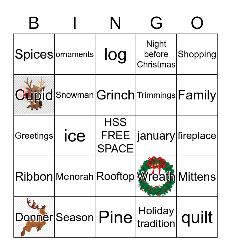 This bingo card has 31 images, a free space and 137 words: Santa, Stockings, Candy, Angel, Holly, Wreath, Elf, Chimney, Bells, Sleigh, Candles, Snowflake, Nutcracker, Reindeer, Driedel, Candy cane, Menorah, ginger bread man, Gifts, Vacation, Mittens, Scarf, Blizzard, Shovel, ice, ornaments, lights, candy cane, skates, boots, hot cocoa, warm, fireplace, sweater, coat, jacket, hat, December, Decorations, 777, Eggnog, Family, Family gathering, Feast, Festival, Figgy pudding, Fruitcake, Gift exchange, Gingerbread house, cookies, Greetings, Grinch, Ham, Holiday, Holiday celebration, Holiday greetings, Holiday magic, Holiday party, Holiday spirit, Holiday tradition, Icicles, Jingle bells, Jolly wishes, Joy, Letter to Santa, Lists, Lump of coal, Mistletoe, Menorah, Spices, Midnight service, Pie, Miracle, Hanukkah, Mirth, Mrs. Claus, Night before Christmas, North Pole, Ornaments, Parade, Peppermint, Pine, Presents, Ribbon, Roaring fire, Rooftop, Rudolph, Santa's workshop, Scrooge, Season, Secret Santa, penguin, Shopping, Sled, Sleigh bells, snow globe, Snow, Snow angel, Snowfall, Snowman, teddy bear, stove, ski, Star, Starlight, Stocking stuffer, melt, quilt, snowflake, log, Tinsel, Toys, Tradition, january, Trimmings, Trumpets, fruitcake, hockey, Winter, Winter wonderland, 3 Wise Men, earmuffs, Wrapping paper, Wreath, artic, below zero, Dasher, Dancer, Prancer, Vixen, Comet, Cupid, Donner, Blitzen, Giving, Nutcracker and HSS.