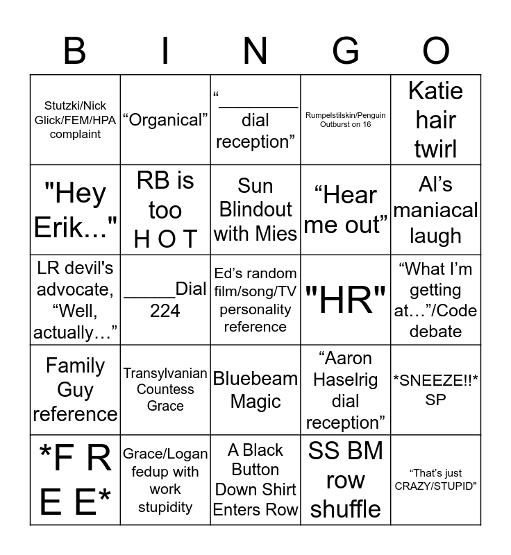 This bingo card has 27 words: “Aaron Haselrig dial reception”, “That’s just CRAZY/STUPID", “Hear me out”, A Black Button Down Shirt Enters Row, "Hey Erik...", “________ dial reception”, “Organical”, Family Guy reference, "HR", *SNEEZE!!* SP, LR devil's advocate, “Well, actually…”, Rumpelstilskin/Penguin Outburst on 16, *F R E E*, Grace/Logan fedup with work stupidity, Al’s maniacal laugh, P vs. P, RB is too H O T, Sun Blindout with Mies, Transylvanian Countess Grace, Stutzki/Nick Glick/FEM/HPA complaint, “What I’m getting at…”/Code debate, SS BM row shuffle, _____Dial 224, Ed’s random film/song/TV personality reference, Bluebeam Magic, Katie hair twirl and “Are you dun yet?” “Vee need to study ‘zis…” “Where is Al?”.