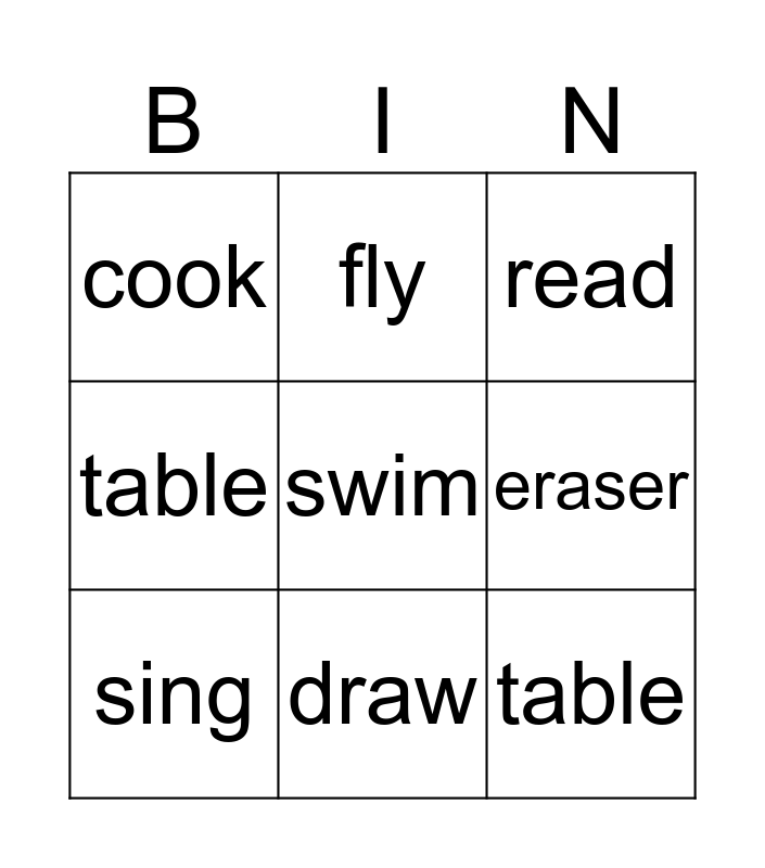This bingo card has 10 words: draw, read, cook, swim, table, sing, fly, chair, eraser and table.