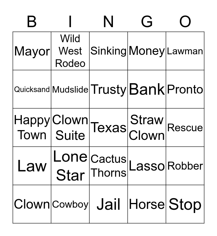 This bingo card has a free space and 24 words: Lone Star, Cowboy, Trusty, Clown, Lawman, Mayor, Quicksand, Wild West Rodeo, Straw Clown, Cactus Thorns, Bank, Happy Town, Lasso, Robber, Mudslide, Horse, Rescue, Sinking, Pronto, Clown Suite, Stop, Law, Money and Jail.