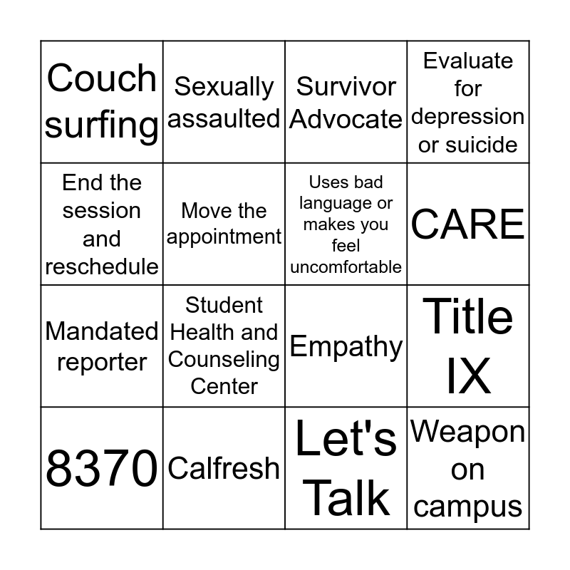 This bingo card has 20 words: 8370, Confidentiality Agreement Form, Survivor Advocate, Title IX, Project Hope, Student Health and Counseling Center, Let's Talk, Evaluate for depression or suicide, Mandated reporter, Sexually assaulted, Empathy, CARE, Couch surfing, Calfresh, Uses bad language or makes you feel uncomfortable, EAN, End the session and reschedule, Move the appointment, Campus police and Weapon on campus.