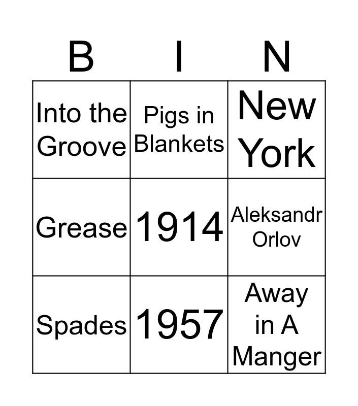 This bingo card has 20 words: Thirteen, Carrot, New York, Paul Young, David Bowie, 1914, Stilton, Into the Groove, Away in A Manger, Pigs in Blankets, Del & Rodney Trotter, 2 Become 1, Aleksandr Orlov, Pheasant Shooting, Spades, Green, 1957, Grease, Mince Pie and Chris Kamara.
