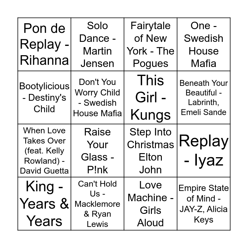 This bingo card has 46 words: Free!, King - Years & Years, All My Friends - Snakehips, Tinashe, Chance The Rapper, Peanut Butter Jelly - Galantis, Sexual - NEIKED, Don't Be So Hard on Yourself - Jess Glynne, Solo Dance - Martin Jensen, Levels - Avicii, Don't You Worry Child - Swedish House Mafia, Castle on the Hill - Ed Sheeran, This Girl - Kungs, One - Swedish House Mafia, Hold On, We're Going Home - Drake, Majid Jordan, Sing - Ed Sheeran, Midnight City - M83, What Makes You Beautiful - One Direction, Beneath Your Beautiful - Labrinth, Emeli Sande, Can't Hold Us - Macklemore & Ryan Lewis, About You Now - Sugababes, Bootylicious - Destiny's Child, Replay - Iyaz, Crazy In Love - Beyonce, JAY-Z, Pon de Replay - Rihanna, When Love Takes Over (feat. Kelly Rowland) - David Guetta, Ride Wit Me - Nelly, City Spud, Raise Your Glass - P!nk, TiK ToK - Kesha, Hip's Don't Lie - Shakira, Irreplaceable - Beyonce, Empire State of Mind - JAY-Z, Alicia Keys, Yeah 3x - Chris Brown, S&M - Rihanna, OMG - Usher, will.i.am, A Thousand Miles - Vanessa Carlton, Star Girl - McFly, Keep On Movin' - Five, Love Machine - Girls Aloud, Reach - S Club 7, You've Got The Love - Florence + The Machine, All I want for Christmas Is You - Mariah Carey, Underneath the Tree - Kelly Clarkson, Fairytale of New York - The Pogues, Step Into Christmas Elton John, Stronger - Kanye West, Get Right (feat. Fabolous) - Jennifer Lopez and Drops of Jupiter - Train.