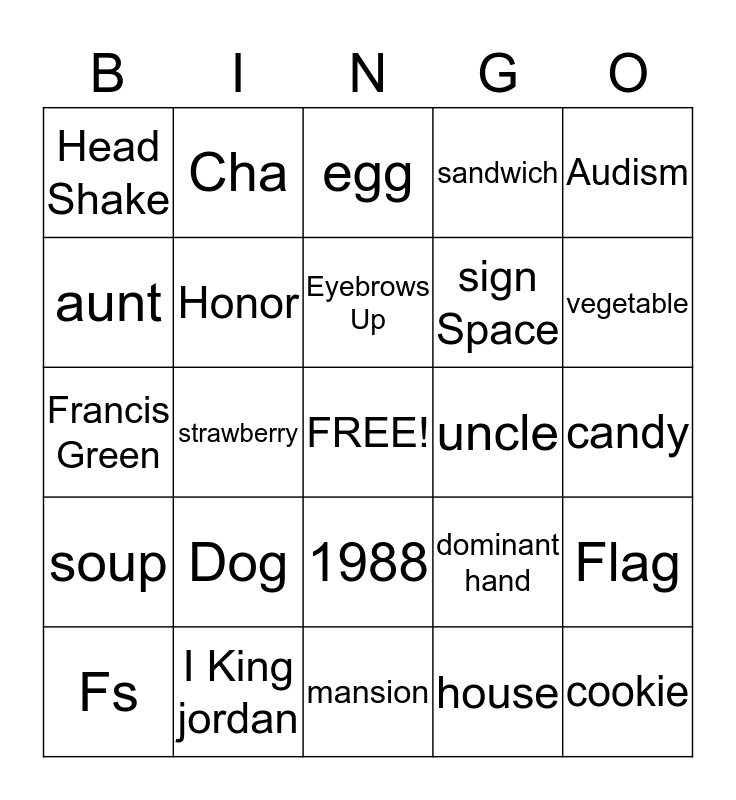 This bingo card has a free space and 24 words: Dog, I King jordan, Eyebrows Up, Fs, Audism, Head Shake, aunt, Cha, uncle, 1988, sign Space, Francis Green, dominant hand, Flag, Honor, house, candy, egg, vegetable, strawberry, cookie, soup, sandwich and mansion.