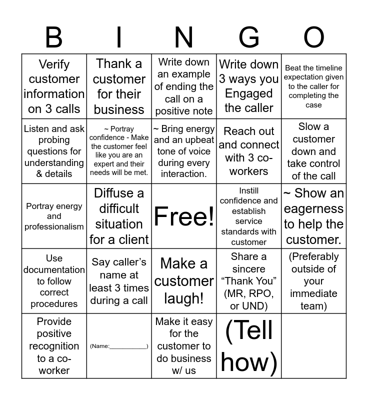 This bingo card has a free space and 24 words: Provide positive recognition to a co-worker, (Name:___________), Reach out and connect with 3 co-workers, (Preferably outside of your immediate team), Diffuse a difficult situation for a client, Write down 3 ways you Engaged the caller, Verify customer information on 3 calls, Write down an example of ending the call on a positive note, Beat the timeline expectation given to the caller for completing the case, Say caller’s name at least 3 times during a call, Instill confidence and establish service standards with customer, Portray energy and professionalism, Make it easy for the customer to do business w/ us, (Tell how), Listen and ask probing questions for understanding & details, Make a customer laugh!, Slow a customer down and take control of the call, Thank a customer for their business, Share a sincere “Thank You” (MR, RPO, or UND), Use documentation to follow correct procedures, ~ Bring energy and an upbeat tone of voice during every interaction., ~ Show an eagerness to help the customer., ~ Portray confidence - Make the customer feel like you are an expert and their needs will be met. and ~ Open the call with a warm greeting to the customer..