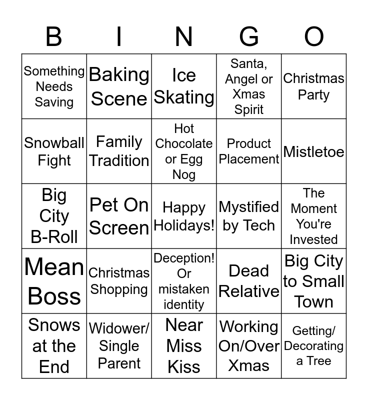 This bingo card has a free space and 27 words: Dead Relative, Christmas Name, Product Placement, Near Miss Kiss, Snowball Fight, Ice Skating, Baking Scene, Mean Boss, Mystified by Tech, Big City to Small Town, Big City B-Roll, Santa, Angel or Xmas Spirit, Snows at the End, Widower/ Single Parent, Mistletoe, Car Decal Removed, Family Tradition, Hot Chocolate or Egg Nog, Christmas Shopping, Something Needs Saving, The Moment You're Invested, Working On/Over Xmas, Pet On Screen, Getting/ Decorating a Tree, Deception! Or mistaken identity, Christmas Party and Christmas Pageant.