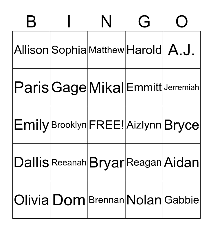 This bingo card has a free space and 24 words: Reeanah, Dom, Mikal, Olivia, A.J., Allison, Paris, Sophia, Aizlynn, Bryar, Emmitt, Emily, Reagan, Aidan, Gage, Nolan, Bryce, Matthew, Jerremiah, Brooklyn, Gabbie, Dallis, Harold and Brennan.