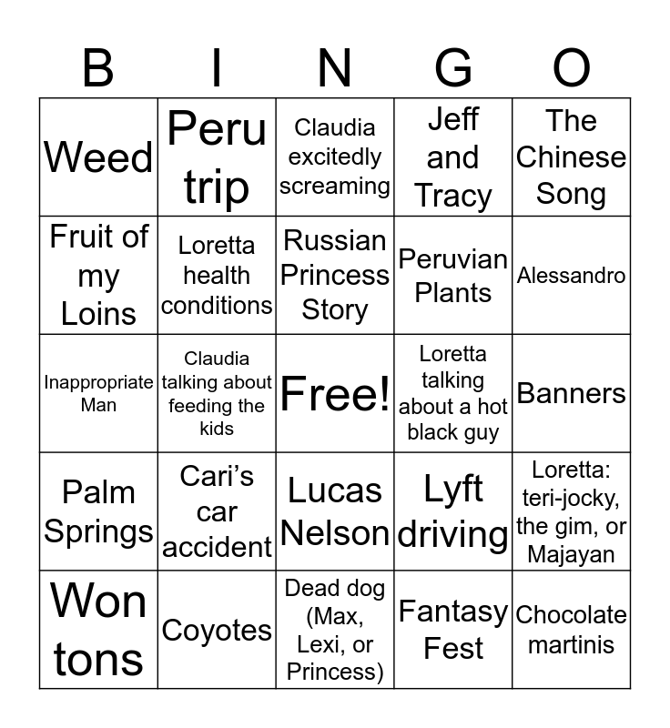 This bingo card has a free space and 25 words: Cari’s car accident, Dead dog (Max, Lexi, or Princess), Russian Princess Story, Won tons, The Chinese Song, Weed, Fruit of my Loins, Peru trip, Loretta talking about a hot black guy, Lucas Nelson, Peruvian Plants, Inappropriate Man, Lyft driving, Loretta: teri-jocky, the gim, or Majayan, Loretta health conditions, Guacamole, Banners, Claudia excitedly screaming, Alessandro, Claudia talking about feeding the kids, Chocolate martinis, Coyotes, Palm Springs, Jeff and Tracy and Fantasy Fest.