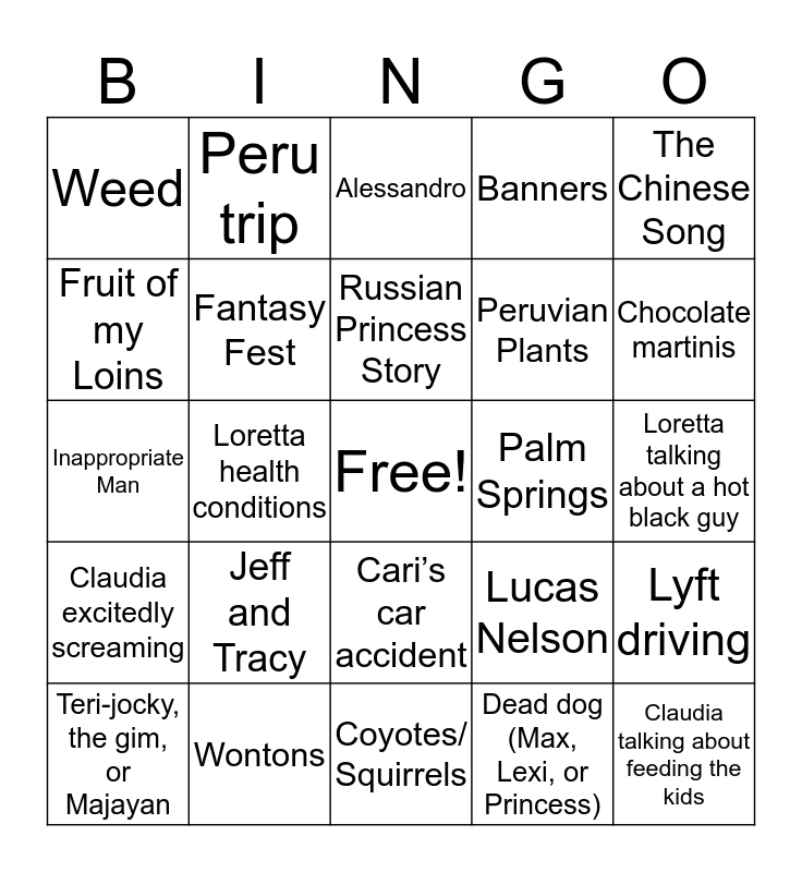 This bingo card has a free space and 26 words: Cari’s car accident, Dead dog (Max, Lexi, or Princess), Russian Princess Story, Wontons, The Chinese Song, Weed, Fruit of my Loins, Peru trip, Loretta talking about a hot black guy, Lucas Nelson, Peruvian Plants, Inappropriate Man, Lyft driving, Teri-jocky, the gim, or Majayan, Loretta health conditions, Guacamole, Banners, Claudia excitedly screaming, Alessandro, Claudia talking about feeding the kids, Chocolate martinis, Coyotes/ Squirrels, Palm Springs, Jeff and Tracy, Fantasy Fest and The Jaws/ Mexican Hat dance song.