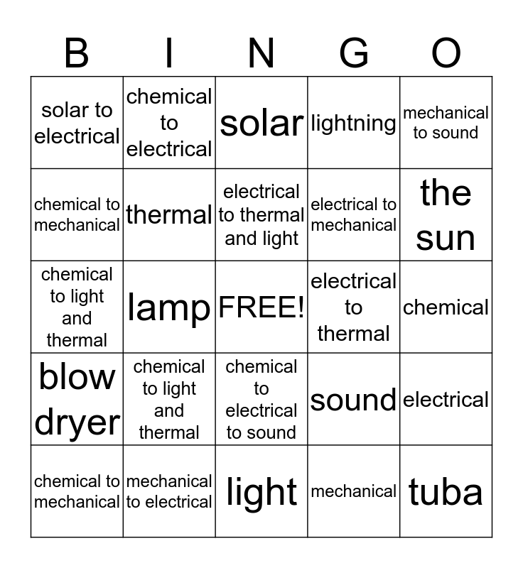 This bingo card has a free space and 24 words: chemical to light and thermal, mechanical to electrical, electrical to thermal and light, chemical to mechanical, mechanical to sound, solar to electrical, chemical to mechanical, chemical to electrical, electrical to thermal, chemical to electrical to sound, electrical to mechanical, chemical to light and thermal, sound, electrical, thermal, mechanical, chemical, solar, the sun, lamp, tuba, blow dryer, lightning and light.